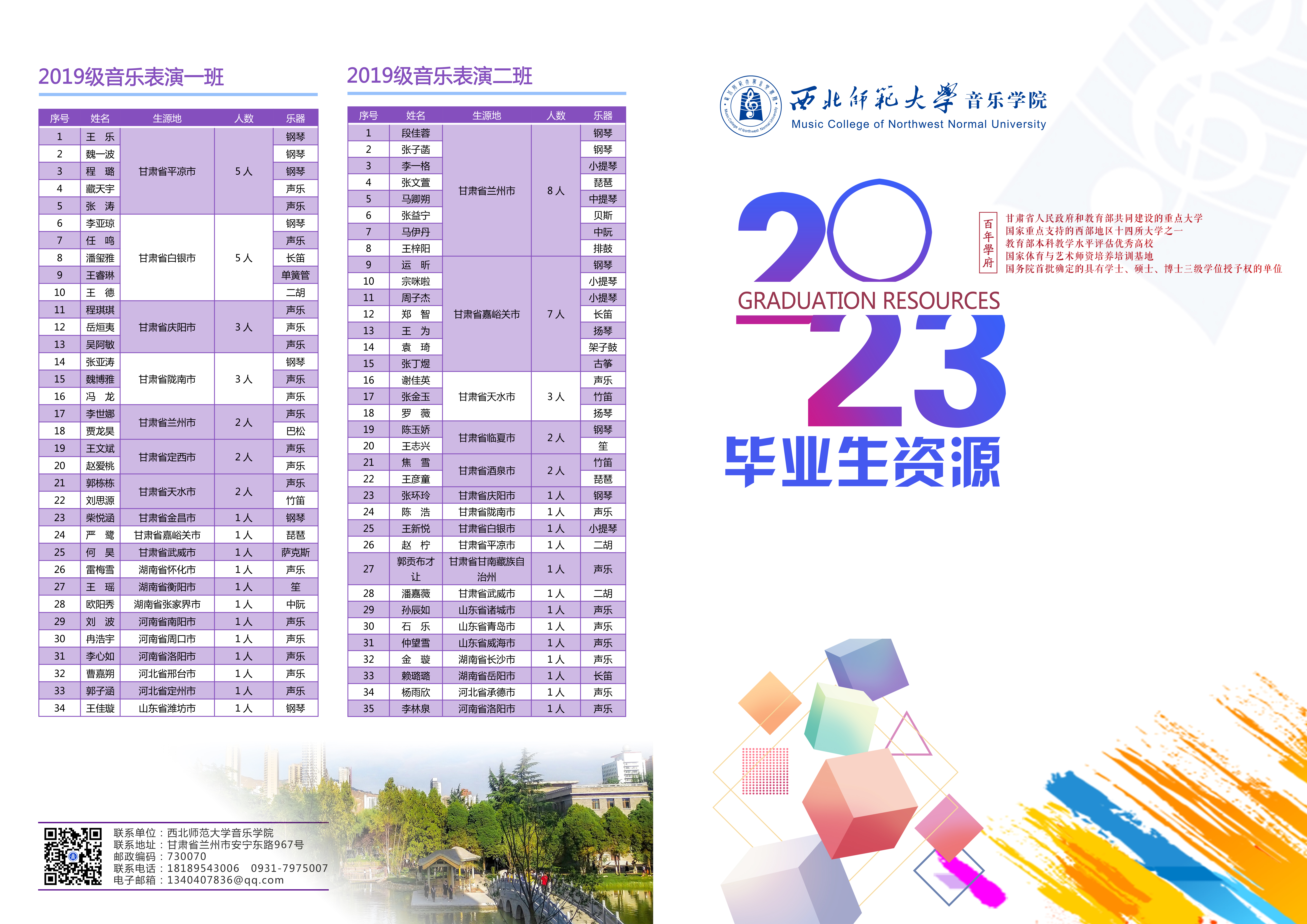 一、硕士研究生63人;音乐与舞蹈学16人;艺术硕士(音乐)46人;教育硕士(学科教学音乐)1人。音乐与舞蹈学:钢琴教学与演奏方向1人;音乐与舞蹈学:中国传统音乐研究方向2人;音乐与舞蹈学:中国音乐史研究方向2人;音乐与舞蹈学:西方音乐史研究方向4人;音乐与舞蹈学:影视音乐研究方向2人;音乐与舞蹈学:作曲与作曲技术理论方向1人;音乐与舞蹈学:音乐教育研究方向3人;音乐与舞蹈学:音乐美学研究方向1人;艺术硕士(音乐)音乐教育方向22人;艺术硕士(音乐)声乐演唱方向11人;艺术硕士(音乐)键盘器乐演奏方向7人;艺术硕士(音乐)作曲方向6人。二、本科毕业生123人音乐学(音乐教育)专业人:54人声乐方向22人;钢琴11人;二胡2人音乐表演专业69人:声乐方向27人;钢琴12人欢迎各用人单位选用威尼斯官网毕业生!联系电话研究生:0931-7971894 朱老师本科生:0931-7975007 18189543006 马老师学院办公室:0931-7975585 王老师