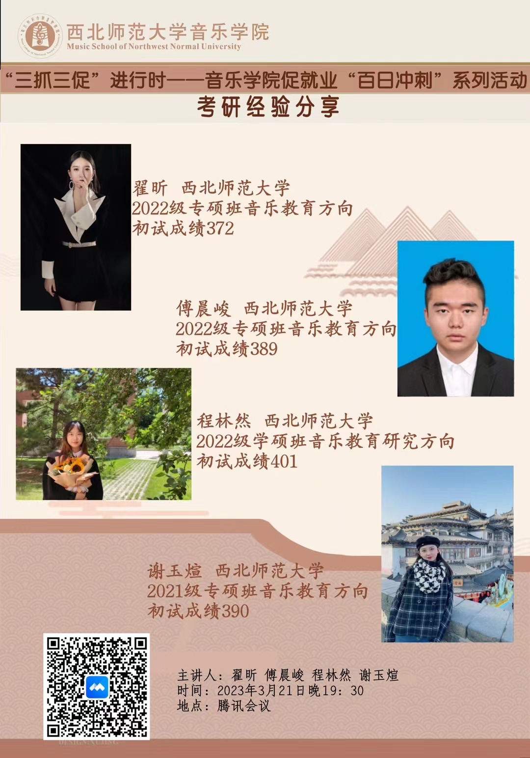 为进一步提高学院学生考研积极性,帮助同学们了解考研信息,给同学们提供科学有效的备考策略,3月21日晚,学院于线上举办了“三抓三促行动”进行时——welcome登录入口威尼斯促就业系列活动之考研经验分享会。本次会议邀请了翟昕、傅晨峻、程林然、谢玉煊四位在初试及复试过程中表现优异的学长学姐为同学们做分享,会议由专职辅导员马全勇主持。各位主讲人结合自身备考及应试经历,从考研动机、择校经验、计划制定、备考方法、时间安排、应试技巧及注意事项等方面,为同学们做了细致、全面的分享。针对英语、政治、专业课的复习,主讲人也分享了自己的备考经验,如怎样提高记忆效率、如何去啃真题、可以利用哪些优质的网络资源等。另外,对于压力的释放、作息的安排及心态的调整,学长学姐们也分享了自己的小技巧。分享过程中,学长学姐们倾囊相授,毫无保留,有效增强了同学们考研的信心。最后,马全勇对四位主讲人表示了感谢。他希望同学们能够认真地“停进去、记下来、做起来”,最后在日复一日的坚持与努力中取得自己满意的战果。文字编辑:李一炘海报制作:李一炘审核:段昱华、王岐堃