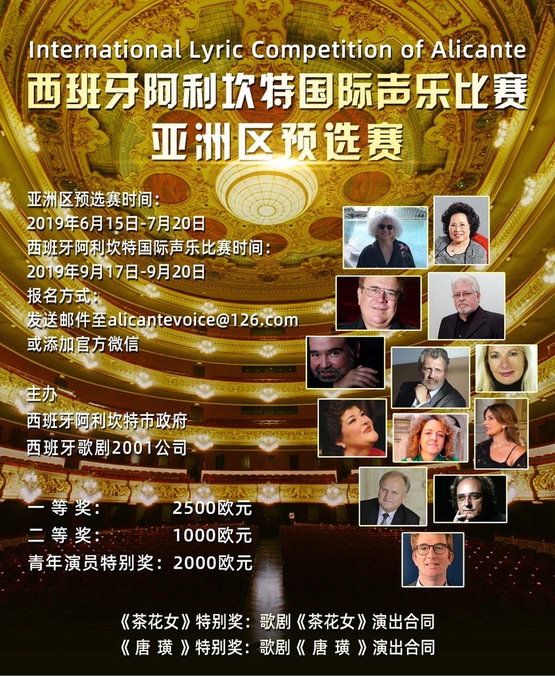 西班牙阿利坎特国际声乐比赛面向全世界青年声乐选手开放比赛旨在加强中国西班牙两国文化交流发现优秀青年歌剧人才提高选手演唱水平及舞台表现能力为歌剧人才提供国际舞台。声乐比赛由西班牙阿利坎特市政府与西班牙歌剧2001公司共同举办,评委为欧洲各国艺术节总监、著名歌唱家及经纪人组成,旨在挑选优秀歌唱人才作为世界歌剧舞台的未来之星。