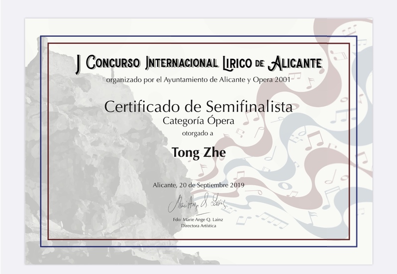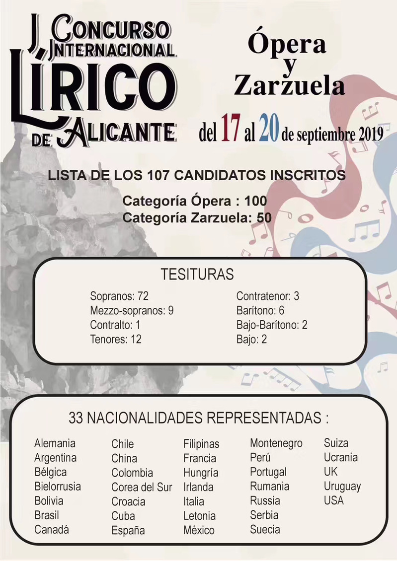 西班牙阿利坎特国际声乐比赛(International Lyric competition of Alicante)将在著名的西班牙海滨旅游城市阿利坎特举办,面向全球各国国籍的青年选手,并为其提供歌唱事业发展的机会及平台。