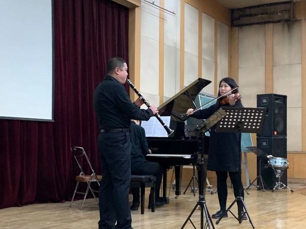 音乐会以浪漫主义时期德国伟大的天才作曲家布鲁赫晚期室内乐三重奏《八首小品》之一、二乐章开场。在晏斐老师(单簧管)、赵心怡(小提琴)、高梓豪(钢琴)的默契演奏下,那柔美温和的旋律缓缓交织,带着浓浓的秋天般的气息,深深地打动了台下的观众。