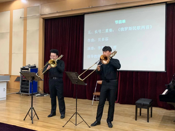 长号二重奏《俄罗斯民歌》由李争胡、王雨演奏。第一长号排山倒海般的音色与第二长号轻巧细腻的音色形成鲜明对比,但又不失美感,充分展现了俄罗斯民族刚柔并济的鲜明特点。