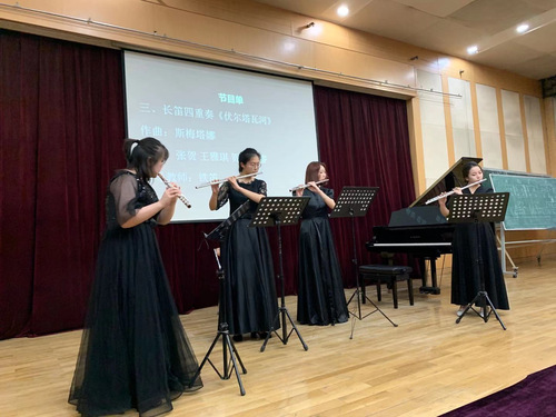 构思巧妙、近似音画交响诗的长笛四重奏《伏尔塔瓦河》由张贺、王雅琪、贺嘉、龚睿演奏。长笛悠扬抒情的音色如溪水般轻缓流动、温婉如歌,仿佛让观众看到了瓦尔塔瓦河两岸迷人的自然风光,使人流连忘返。