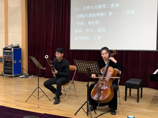 莫扎特创作的大管与大提琴二重奏《降B大调奏鸣曲》第一、第二乐章由张天、茹倩演奏,大提琴柔美的前奏缓缓引入了大管跳跃活泼的莫扎特式分解和弦,犹如暖暖夕阳下的水晶,散发着温柔的余晖,渐渐融化人心。其精彩纯粹的炫技段落与古典主义时期音乐的华丽风格相映生辉。
