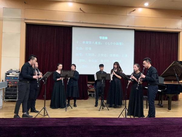 最后,王珂煜、王俊达、张佳雨、王琳、王睿琳、单登恒、张宇轩、陈转男共同演奏了单簧管八重奏《七个小画像》,音乐风格轻盈梦幻,段落清晰分明,每一段都富有强烈的标题幻想性,是典型的浪漫主义时期的佳作。