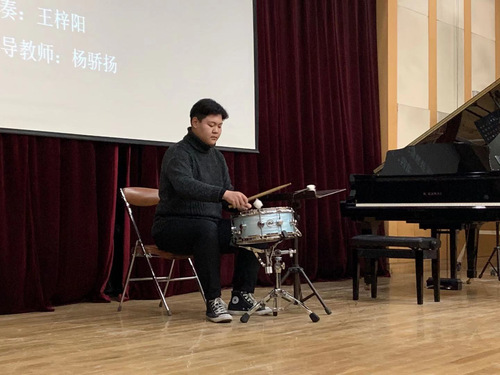 王梓杨同学为大家带来了小军鼓演奏的《芬客组曲》第四、第五乐章。这首作品短小精悍,演奏者聚精会神,整齐而复杂的节奏加上频繁的强弱对比展现了室内打击乐丰富的艺术表现力。
