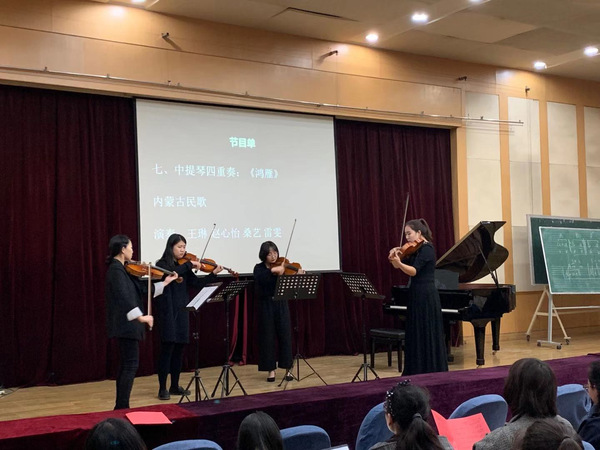 王琳、赵心怡、桑艺、雷雯演奏的中提琴重奏《鸿雁》充满了浓郁的蒙古族韵味,中提琴丰富的音色仿佛马头琴般沧桑悠长,为这首乐曲增添了些许古老神秘的色彩。