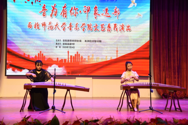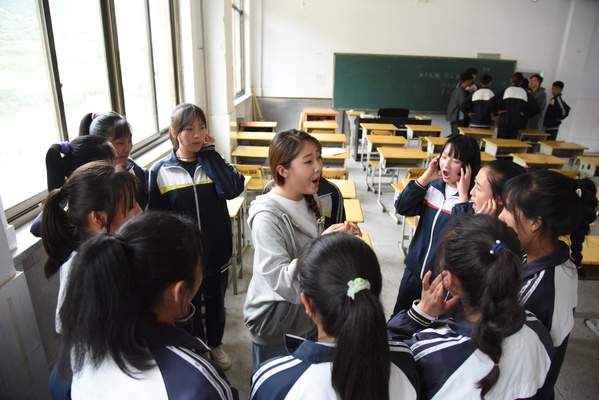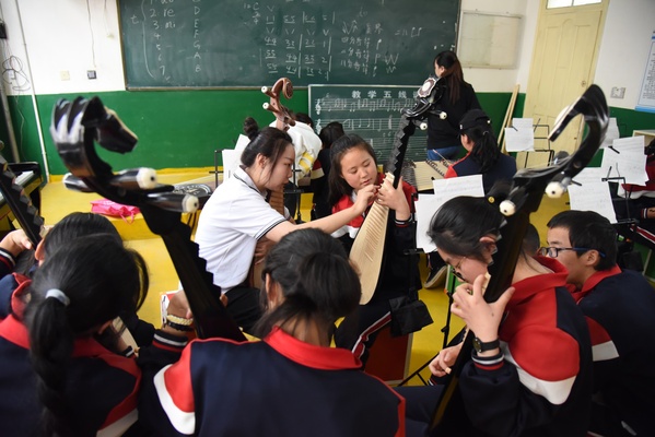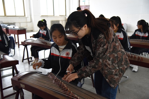 在迭部县高级中学,声乐专业的成员认真聆听了同学们动人的歌声,欣赏了独具特色的原生态唱法,实践队员就同学们的演唱进行认真指导,从气息、口型、舞台站姿等方面逐一说明,并在现场示范演唱。古筝专业的两名成员细心校正了同学们的乐器音准,给社团同学们手把手指导弹奏指法,强调基础训练的重要性,调动了同学们学习古筝的积极性。