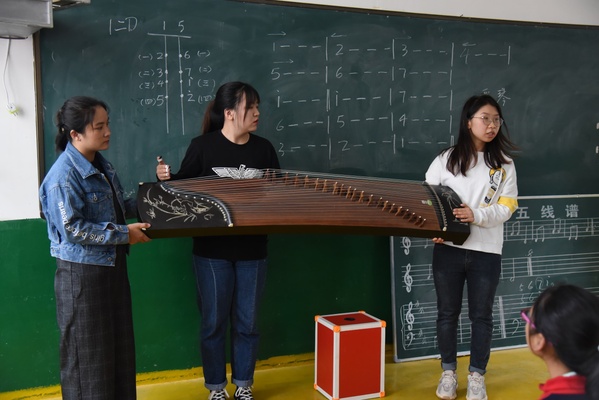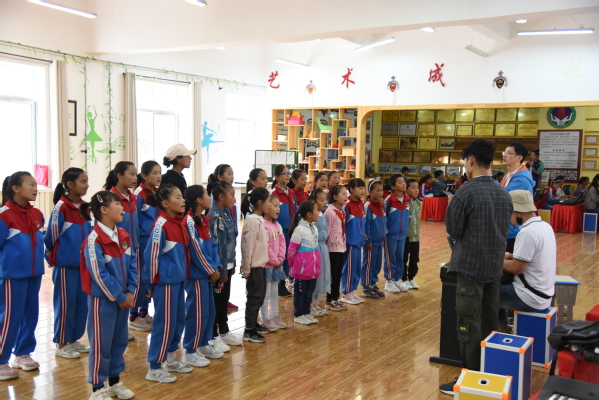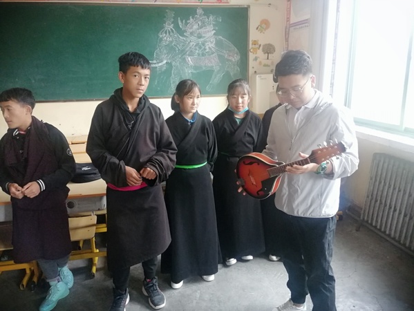 在藏族中学,团队成员参观了学校的音乐设施,看到了琳琅满目的乐器展览室,以及经过改良的藏吉他——“曼陀铃”等特色藏族乐器,欣赏了音乐社团精彩的藏歌弹唱,同学们的表演具有较强的专业性,令大家耳目一新。在迭部初中,团队成员认真指导电子琴社团的兴趣活动,给民乐社团的同学们逐一介绍乐器种类,分别讲解扬琴、古筝、月琴、二胡、琵琶等民族乐器的构造。同时,实践队员给同学们讲解了最基本的乐理知识,并利用现学的基础知识学习演奏了歌曲《小星星》,充分激发了同学们的学习热情。在城关小学和电尕镇中心小学,实践队员欣赏了小学生们演唱的藏族民歌,辅导电子琴社团的孩子们演奏《放学歌》,同学们认真好学的劲头感染了在场的每一名队员。