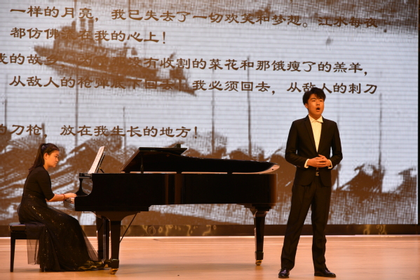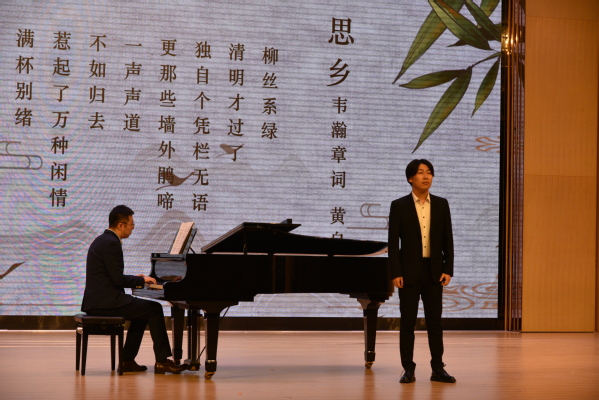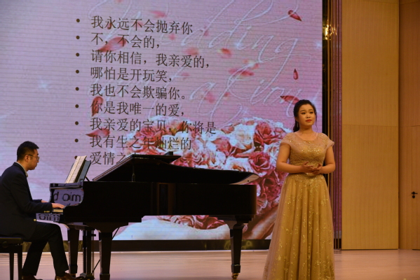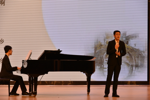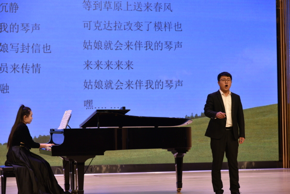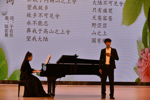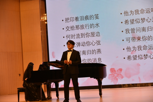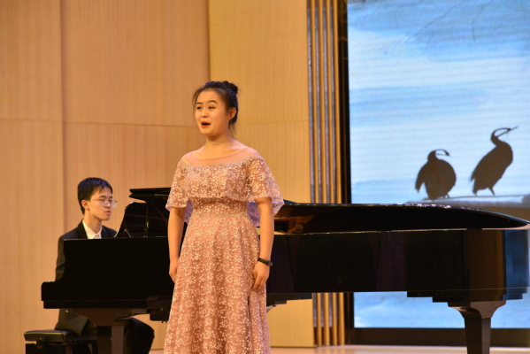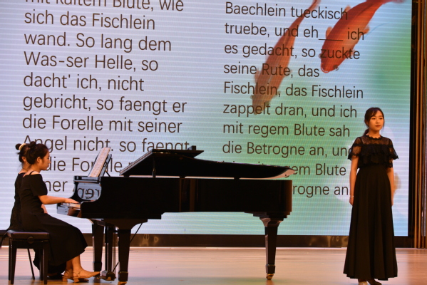 音乐会在委婉动人的艺术歌曲《渔翁道情》中拉开帷幕,其文雅如诗般的歌词配以细腻如水般的钢琴伴奏,使台下听众如痴如醉。在钢琴活泼俏皮的分解和弦的衬托下,明朗清澈的女声跃然而上,这首充满生命情趣的艺术歌曲《鳟鱼》将整场音乐会推向高潮。音乐会在多首经典歌曲演唱后走向尾声,使台下师生真切地了解了中外音乐文化的异与同,可谓是一场充满辩证的艺术盛宴。