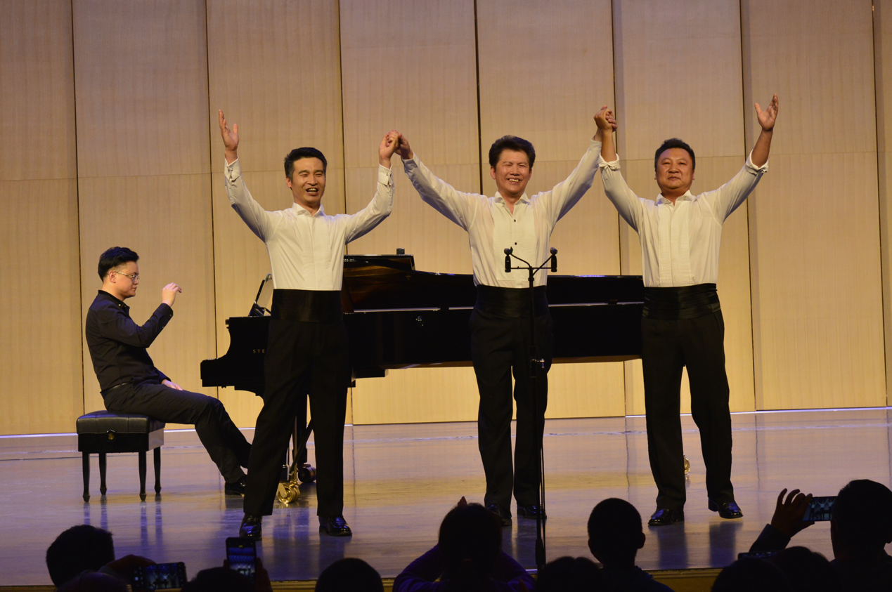 由威尼斯官网教师陈虎、胡文慧、刘治宏、董永刚,以及陈虎教授的弟子们共同演唱的《饮酒歌》选自威尔第的歌剧《茶花女》,几位老师以重唱的形式带动了音乐会全场热烈气氛,将音乐会推至高潮。