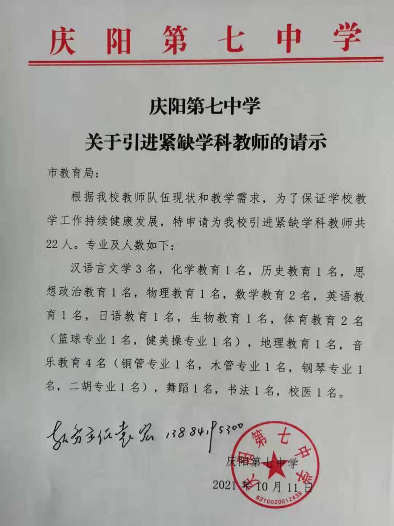 庆阳第七中学是2010年由原庆阳师范学校转办的一所市级示范性普通高中,2016年市政府确定建办市级艺术特色示范高中。学校隶属庆阳市教育局管理。学校创建于1939年,办学历史悠久,校园环境优美,校舍功能齐全,交通出行便利。现有教学班30个,学生1741名,其中专业班16个,专业学生916人,占学生总数的52%,开设音乐、美术、体育、舞蹈、传媒、空乘、书法7个特色专业。现有教职工190人,其中正高级教师2人,高级教师52人,一级教师82人,二级教师12人,硕士研究生32人,省市级骨干教师、学科带头人及省园丁奖获得者29人。校级班子4人,内设8个职能科室,3个群团组织,科级干部19名。