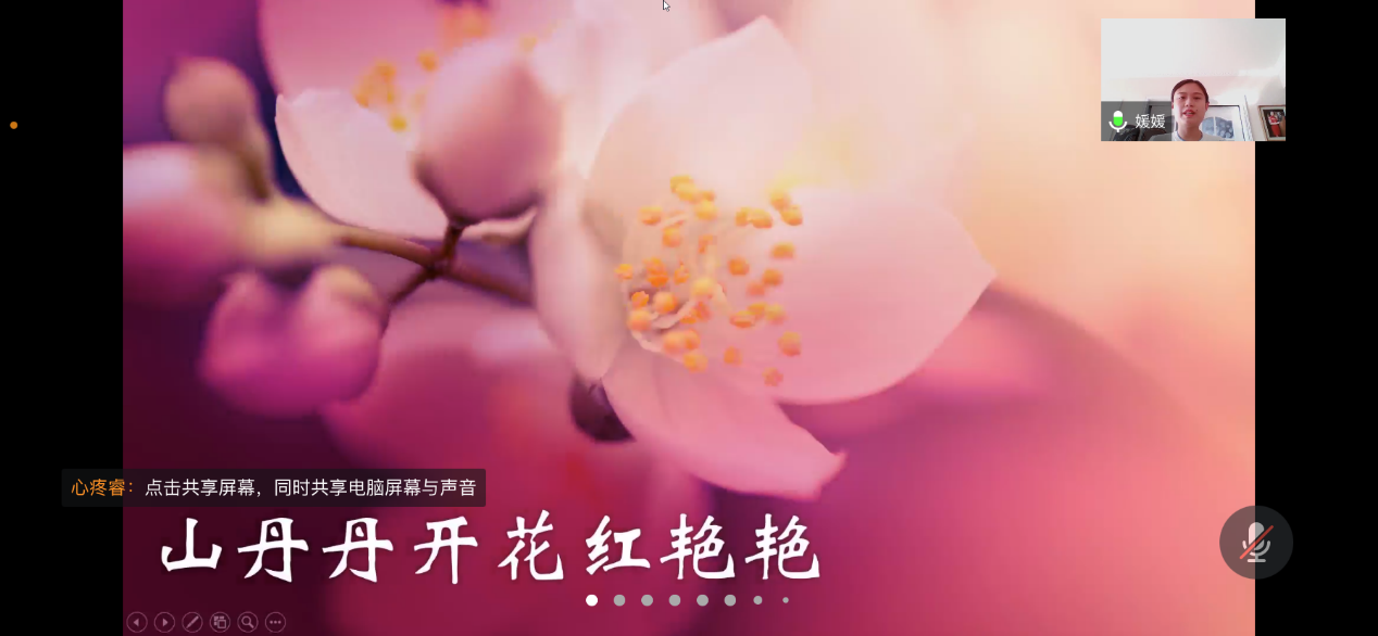 李佳媛同学从作品背景、曲式分析以及演奏技巧几个方面,讲解了古筝曲《山丹丹花开红艳艳》。这首筝曲由同名歌曲改编而来,具有纯朴、高亢的“信天游”风格,描述了红军长征胜利抵达陕北时,正逢满山的山丹丹花开的美丽情景。