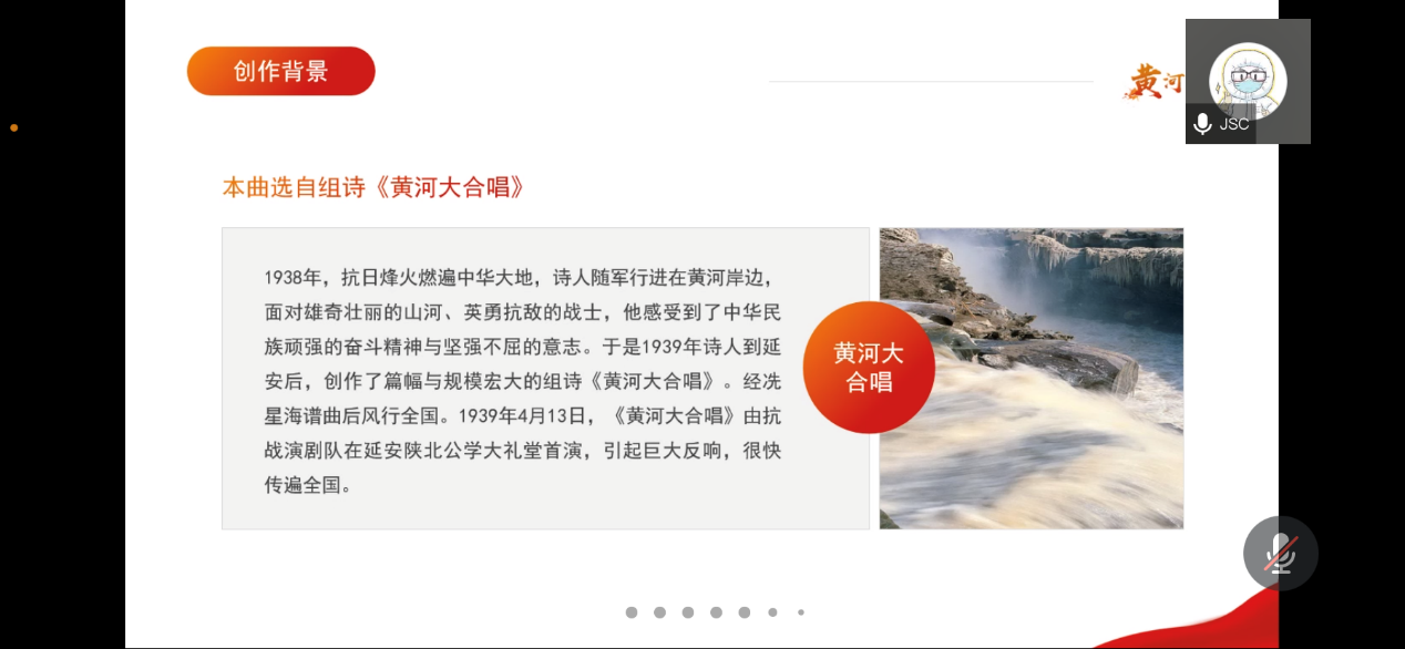 江守程同学为大家讲解了《黄河大合唱》中的第二乐章《黄河颂》。歌曲以宽厚的气息展现了黄河的波澜壮阔、以奔放的旋律赞誉了中国五千年的文化、在热情激昂中歌颂了伟大的民族精神,整首作品气势磅礴、振奋人心。