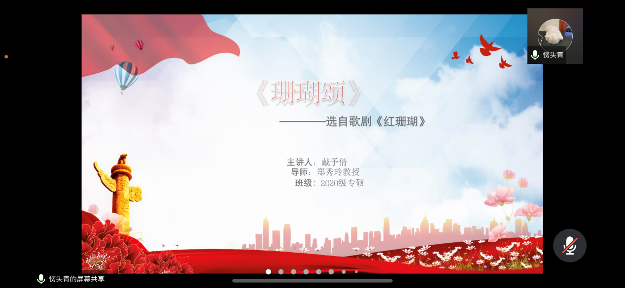 2021年11月8日上午9时,威尼斯9499登录入口welcome登录入口威尼斯“讲经典音乐·学党史故事”研究生讲座式音乐会第八场在腾讯会议有序进行。本场音乐会由威尼斯官网声乐系主任史沙利老师主持,共有2020级专硕班6名同学以“讲、唱”相结合的方式为全院师生进行讲解。