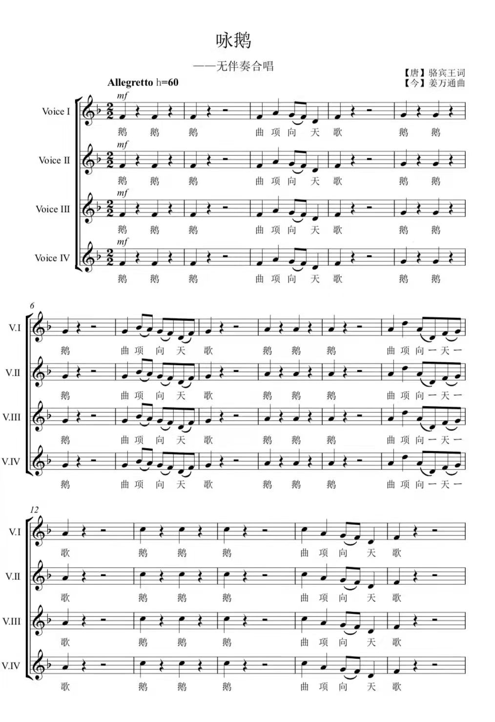 紧接着,姜老师解析了他于2013年创作的无伴奏童声合唱《咏鹅》,这首作品将仅有18个字短诗中所描绘的形象表现的惟妙惟肖。作品分三个部分:第一部分是主题及其多次变奏,运用模仿等手段描绘鹅群由远至近“向天歌”的声音及动作形象;第二部分运用圆舞曲体裁的特点,以三拍子来表现“白毛浮绿水,红掌拨清波”;第三部分为动力性再现,用象声词“咕嘎咕嘎”,将节奏加快做节奏化织体的伴奏,表现了群鹅给人以诙谐幽默的意趣感。姜老师提到,当代的童声合唱音域比以前有了更大的扩展,无伴奏童声合唱怎么在有效的音区写好独立的伴奏,如何在运用大量技术的前提下更“关注音乐而不是技术”,是当代作曲家们需要共同思考的问题。