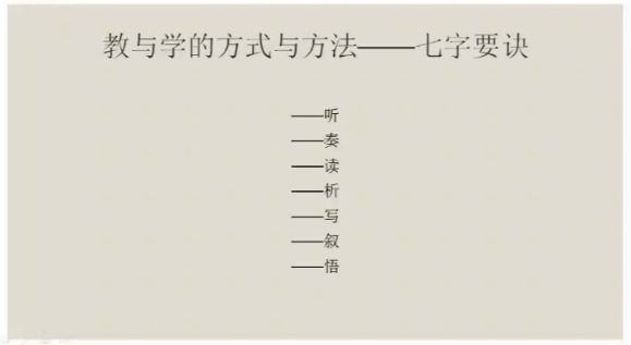 姜老师在他的学习与教学过程中,总结出了教与学的方式与方法——“七字要诀”,分别为:“听”,听不用的风格流派,以作曲家为线索来听“里程碑式”的作品,例如巴赫的《勃兰登堡协奏曲》、斯特拉文斯基的《春之祭》等;“奏”,作曲者要尽自己所能去即弹奏、演奏或演唱;关于“读”,如何阅读总谱?有三种方法:边读谱边听、边读谱边奏及单独阅读总谱,其中单独读谱能有效地训练内心听觉,同时在读谱之余也不能忽略阅读曲目相关文章文献的作用;“析”,即解析,把整体的作品分解,从和声、曲式、配器等各方面剖析,例如欣赏贝多芬著名的《第五交响曲(命运)》,曲中“命运的敲击声”在节奏、节拍和技法上的变化,若不分析乐谱,便与普通的爱乐者没什么区别了,我们要“知其然”,还要“知其所以然”,通过解析乐谱获悉、熟习作曲家的写作技巧;在“听”、“奏”、“读”、“析”之后,便要大量地“写”,写作之后,便要“叙”,“叙”即交流,在交流中巩固基础,在交流中获得双向的进步;最后一点,便是“悟”,“悟”分渐悟和顿悟,姜老师努力让我们明白:渐悟是顿悟的基础。