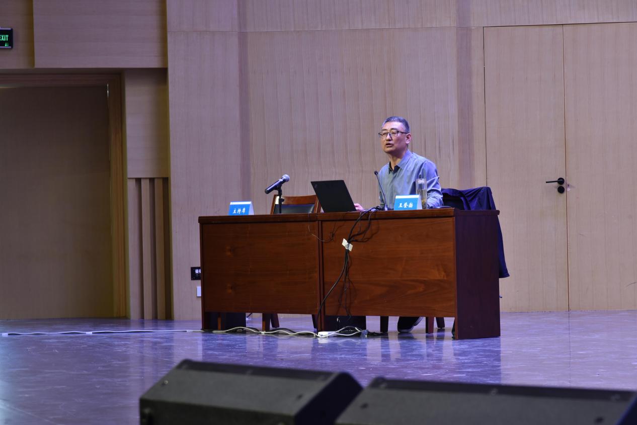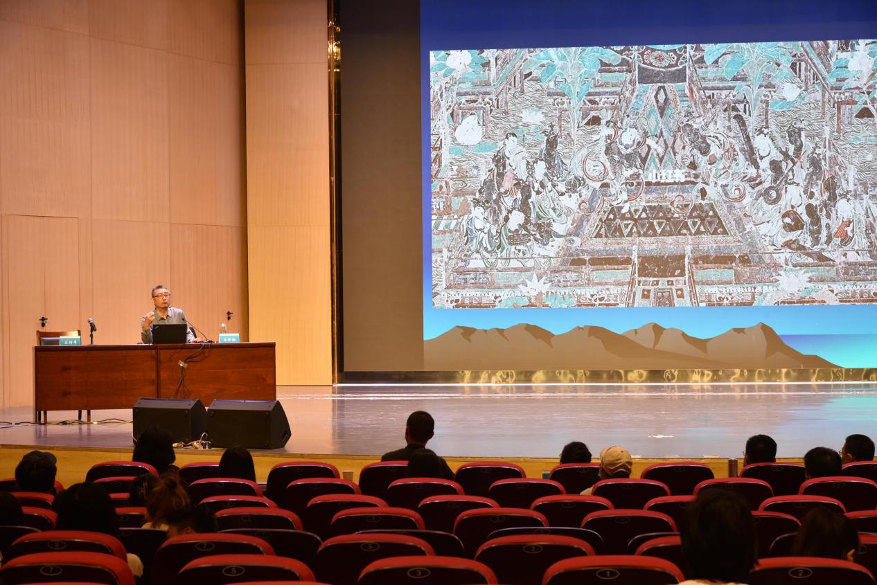 其次,王登渤书记向我们讲述了在甘肃历史文化背景之下所诞生的敦煌艺术。在此,王书记主要向我们展示了涵盖在音乐、美术、舞蹈这三大艺术门类之下的创作成果。譬如,在音乐方面,1900年出土于敦煌藏经洞的25首唐代曲谱,是现存世界上最古老的音乐语言,其艺术价值和历史价值皆属罕见,原件现藏法国巴黎图书馆,并由刘半农在解放前抄回,后来席臻贯在前人的基础上独辟蹊径,将诗、乐、舞连在一体加以研究,同时,他还通过对合竹和易卦的研究,解决了敦煌古乐的和声问题。还有唐玄宗时期盛行的乐舞法曲作品,其中最典型的当推《霓裳羽衣曲》,此曲成为当时糅合胡华音乐素材创制新曲的精品典范。在美术方面,最具代表性的是“敦煌画派”,它是以敦煌为源流,以丝绸之路为背景,以多民族生活为色彩的创作主体取材方向,关注陇原大地乃至整个丝绸之路上曾经发生过的重大历史事件、历史人物;注重表现少数民族生活状态,描绘当今生活变化特别是陇原儿女的精神面貌,同时,还借鉴敦煌莫高窟艺术的表现手法,努力形成反复吟诵、不断深化的主题取向以及讴歌和平、友谊、稳定、共融的丝路精神。而且“敦煌画派”还追求历史的厚重感,在历史与现实风貌的真实再现中追求恢宏气象,使甘肃美术作品笼罩上一层浓重的氤氲,在这种氤氲中突出其雄浑、浩大、开阔的西部之美。在舞蹈方面,《丝路花雨》是近年来最具代表性的创作,作为中华艺术文化的瑰宝,敦煌画壁以其精美绝伦的壁画艺术与取之不尽的史料文物记载为世人所惊叹。舞剧《丝路花雨》便是选取敦煌壁画这座艺术宝库,并在此基础上进行融合创新,其以凝练的舞蹈语汇。将前世文明塑造成为流动的舞姿,在灵动多变的音乐伴奏下,尽显人体曲线美。现场,王登渤书记通过生动形象的作品及丰富翔实的资料,使我们身临其境地感受到敦煌艺术的魅力所在。