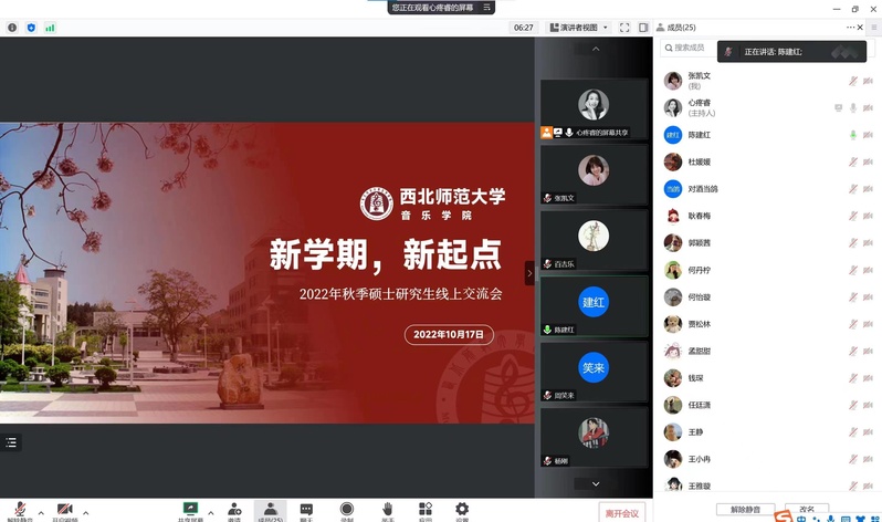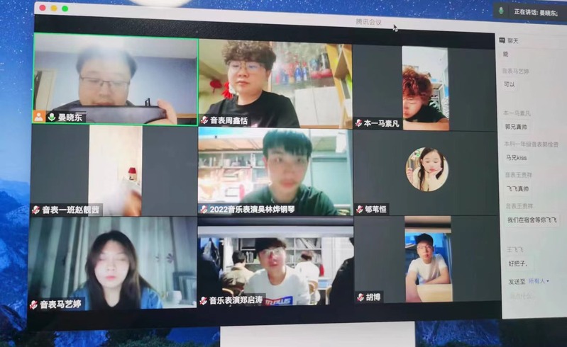 学院党委副书记王岐堃一一解答了2020级音乐学专业本科生的问题和疑惑,鼓励学生继续“明大义、识大体、顾大局”,理解并自觉遵守学校的相关规定。同时,要求同学们文明上网,注意自身网络言行,鼓励大家在课余时间阅读书籍武装头脑,充实自身。学院副院长陈建红和全体在校研究生云端相聚,倾听学生诉求,了解学生困难,探讨了学业的发展与规划;学院副院长晏晓东要求2022级在校本科生要尽早适应大学的学习模式,要系好大学的第一颗扣子,向学识渊博的老师虚心请教,向优秀的学长学姐学习。同时,也进一步向新生强调了要转变身份,严格遵守疫情防控规定,明确自身在校园疫情防控工作中承担的责任与义务;学院副院长孙晓杨与2020级音乐表演专业本科生线上畅聊,鼓励大家提早明确毕业前的目标,制定详细时间规划,朝着目标持之以恒地奋斗。此外,学院班主任、专职辅导员也和同学们进行了交流。