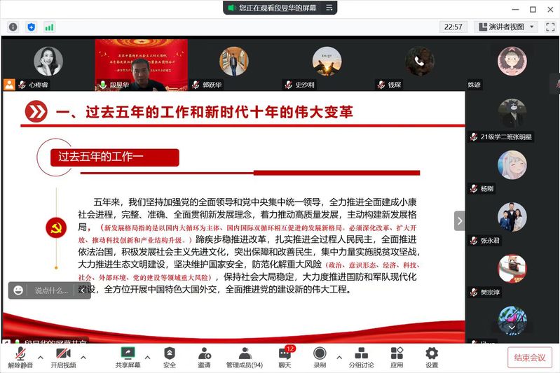 学习会上,段昱华围绕党的二十大的重大现实意义和深远历史意义,大会报告的主要内容和作出的战略部署等方面,对党的二十大报告进行了全面、深入、系统的学习。党的二十大报告回顾总结了过去五年的工作和新时代十年的伟大变革,阐述了开辟马克思主义中国化时代化新境界、中国式现代化的中国特色和本质要求等重大问题,对全面建设社会主义现代化国家、全面推进中华民族伟大复兴进行了战略谋划,对统筹推进“五位一体”总体布局、协调推进“四个全面”战略布局作出了全面部署,为新时代新征程党和国家事业发展、实现第二个百年奋斗目标指明了前进方向、确立了行动指南。党的二十大报告是党和人民智慧的结晶,是党团结带领全国各族人民夺取中国特色社会主义新胜利的政治宣言和行动纲领,是马克思主义的纲领性文献。