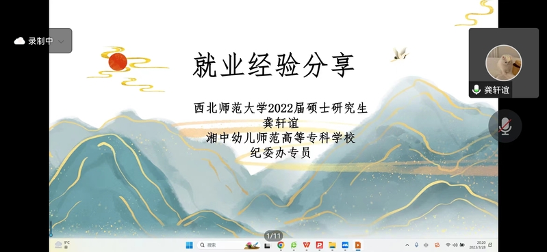 张金顺分别从自我认知、岗位选择、备考技巧、注意事项四个方面分享了如何应聘高校辅导员;景琦分别从招聘信息检索、就业形势分析、笔面试准备三个方面和同学们分享了如何成为一名小学音乐教师。其中,她用视频、图片、数字等形式全面展示了自己当时求职的经历,让同学们深切感受到了就业形势的严峻;龚轩谊分别从what、why、where、when、how“五个W”出发,着重分享了就业地区的选择、校园招聘的优势、简历的投递等,还从简历制作、面试服装及体态等方面与同学们做了交流。