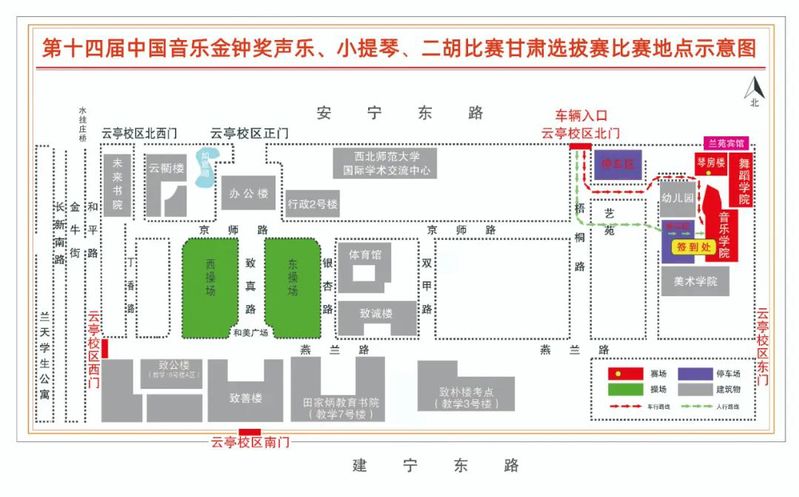 4.参赛选手应按照比赛时段安排,可步行从西北师大云亭校区西门、正门、北门进出校园,如有自驾车辆,凭《参赛证》从西北师大云亭校区北门驶入,就近在规定区域有序停靠。