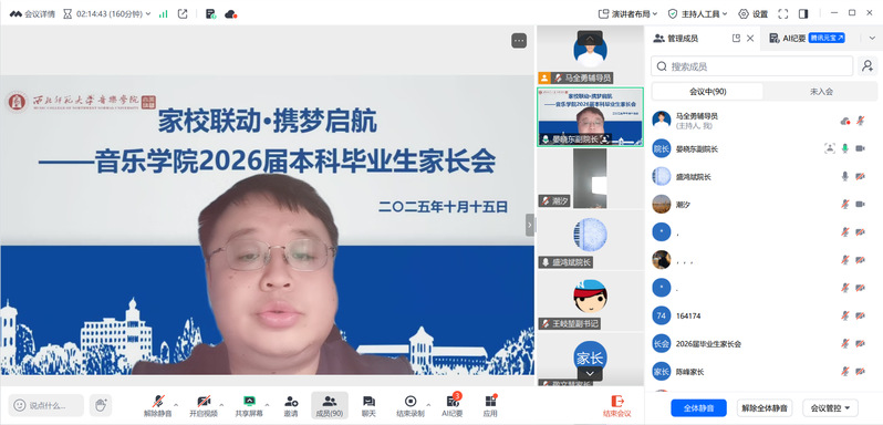 为进一步加强家校联动,用心用情做好2026届毕业生教育管理和服务工作,10月15日晚,学院在线上召开2026届本科毕业生家长会,学院院长盛鸿斌、副院长晏晓东、毕业班班主任、专职辅导员及2026届本科生家长共计90余人参会。会议由学院党委副书记王岐堃主持。