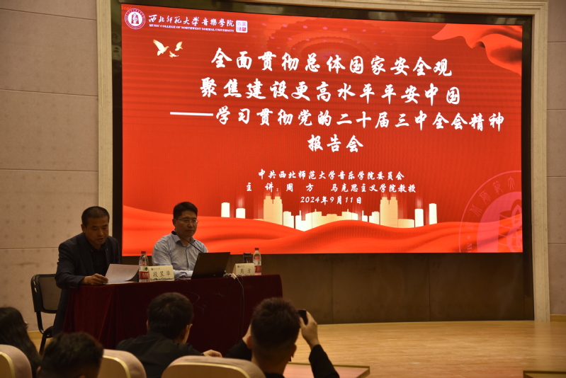 9月11日,学院在欣赏厅举行党的二十届三中全会精神宣讲报告会。报告会由学院党委负责人主持,马克思主义学院周方教授作了题为“全面贯彻总体国家安全观、聚焦建设更高水平平安中国”的报告,学院师生党员、入党积极分子120余人听取了专题报告。周方教授介绍了党的二十届三中全会召开的背景、内容和重大意义。围绕“全面贯彻总体国家安全观、聚焦建设更高水平平安中国”主题,从全面领会总体国家安全观的思想内涵、深刻理解建设更高水平平安中国的战略意义、深刻认识建设更高水平平安中国的显著成就、准确把握建设更高水平平安中国的基本要求、认真落实建设更高水平平安中国的重点任务五个方面进行了全面讲解。学院党委负责人表示,我们要充分深刻认识到党的二十届三中全会是在以中国式现代化全面推进强国建设、民族复兴伟业的关键时期召开的一次十分重要的会议,对新时代新征程上推动全面深化改革向广度和深度进军进行了总动员、总部署。全会审议通过的《决定》既是党的十八届三中全会以来全面深化改革的实践续篇,也是新征程推进中国式现代化的时代新篇,是党的历史上又一重要纲领性文献,在今后的教育教学等各项工作中要不断学习贯彻落实党的二十届三中全会精神。摄影