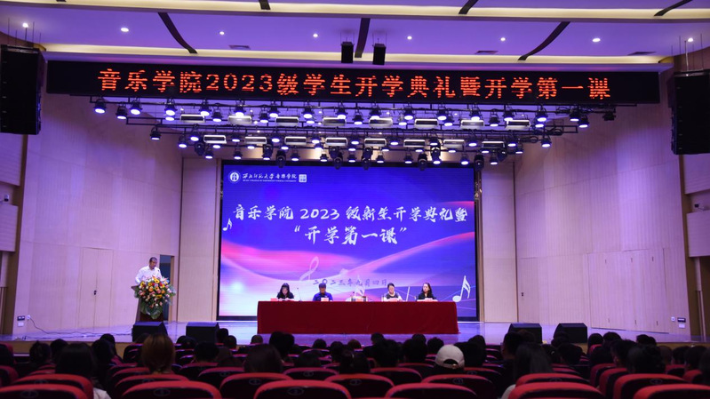 9月4日上午,学院在音乐厅举行2023级学生开学典礼暨“开学第一课”,学院领导班子、系(所、中心)主任、专职辅导员、新生班主任及2023级全体新生共200余人参加,典礼由学院党委副书记王岐堃主持。典礼在全体齐唱庄严的国歌中拉开帷幕。随后,党委书记段昱华致辞,他代表学院全体师生对2023级新同学的到来表示欢迎。段昱华介绍了学院悠久的办学历史和近年来取得的成绩,他从“德”的养成、“智”的学成、“体”的练成、“美”的化成、“劳”的干成五个方面对新生的“五育并举”培养做了要求。2023级专硕班学生冉浩宇代表全体新生做了发言,他们将坚持“崇尚学术,追求卓越”的思想理念,践行“知术欲圆,行旨须直”的八字校训,铭记筚路蓝缕、艰苦奋斗的办学历程。在教师代表发言环节,音乐教育研究中心主任王冰老师从传道、授业、解惑三个方面阐述了自己对于教师这个职业的看法,勉励同学们把握学习机会,珍惜大学生活。典礼第二阶段,音乐学系主任祁明芳老师为全体新生讲授题为“薪火相传·赓续乐章”的开学第一课。她详细讲述了学院八十余年风雨兼程的音乐之路,从专业初创及曲折发展时期、从艰难困苦到发展壮大时期及新世纪阔步前进时期,介绍了先辈