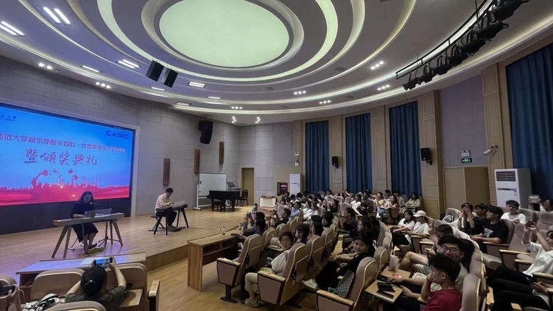 6月15日下午,学院在欣赏厅举办第三届“卡西欧·钢琴专业优秀毕业生评选活动”暨颁奖典礼,学院院长盛鸿斌、党委副书记王岐堃、副院长孙晓杨、甘肃省音协钢琴专业委员会常务副会长徐立、卡西欧电子乐器营业统辖部副部长韩天等出席本次活动,典礼仪式由副院长孙晓杨主持。首先,盛鸿斌、韩天、徐立、孙晓杨、王岐堃等先后为一二三等奖获奖学生颁奖,之后,获奖学生分别用卡西欧电钢琴演奏了多首作品。随后,韩天向大家展示了卡西欧电钢琴的不同音色效果,让大家欣赏到了卡西欧电钢琴的魅力。最后,由韩天和在场师生进行“以琴会友”现场互动。其中,孙晓杨和韩天同台的钢琴演奏,将典礼现场的气氛烘托到高潮。此次活动是学院积极推进校企合作,拓展奖助育人渠道的重要举措。后续,学院将进一步加强校企合作,不断提升人才培养质量。文字编辑:冉浩宇拍摄:闫宇婷审核:段昱华王岐堃