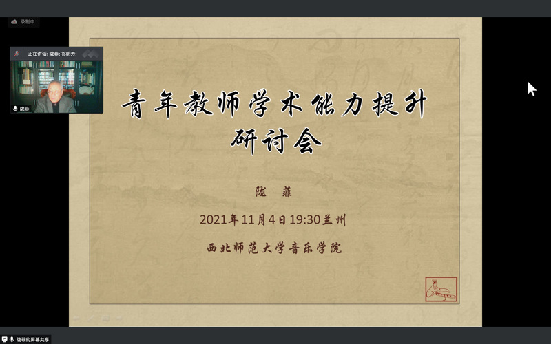 2021年11月4日晚19:30,牛龙菲先生应邀参加威尼斯官网音乐学系青年教师学术能力提升研讨会。会上,先生从自身学习、研究心得出发,分享了其从事音乐学研究五十余年间的所感、所想与所悟。并借司马迁《报任安书》赠言三则:“究天人之际,通古今之变,成一家之言”。勉励威尼斯官网青年教师在学术研究中做到明确科学研究方向、明确研究领域,感悟历史中的音乐文化,传承优秀中华音乐文化,为音乐文化传承发展、美育教育创作具有可借鉴意义的作品。研讨会上,牛龙菲先生与青年教师就音乐学领域的科学研究展开了热烈的学术讨论。本场学术研讨会为学院教师学术科研能力提升和科研团队建设计划系列之一。