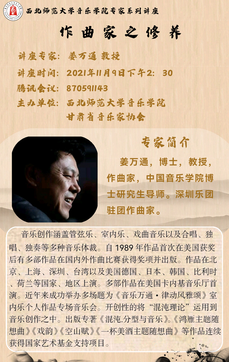 2021年11月9日,姜万通教授应甘肃省音乐家协会、威尼斯9499登录入口welcome登录入口威尼斯“专家系列讲座”之邀,于下午2:30在腾讯会议作《作曲家之修养》专题讲座,会议由welcome登录入口威尼斯执行院长盛鸿斌副教授主持。讲座共分为“作曲家之修养”、“教与学的方式与方法——七字要诀”、“处理好几个关系”、“对老师、学生要说的话”及问答五个环节,并在论述过程中穿插了对四首颇具代表性的创作曲目的解析。“作曲家之修养”谈及作曲家之修养,姜老师首先告诫我们要在具有“广博的知识”的基础上,进行“深入的思虑”,以《我为祖国献石油》、《我和我的祖国》两首耳熟能详的声乐曲目为例,阐述了大小调与五声调式结合的具体办法。“我们既要有艺术家的脑力,又要有体育专家的体力。”作为作曲家,更需要“坚定的意志”;“笃定的行动”,即要去做,更要持续地做,作曲(compose),英文的另一个含义是“排版”。姜老师谈到自己近60年的学艺生涯,对于作曲也仅仅是“略知一二”,并激励我们“失败是成功之母”,往往在坚持不下去的时候就是进步之际,就是成功之机;作曲家还需要通过思考,不断丰富内心世界,获得“丰富的内涵”,并随着时间的推移,不断地沉淀出“深厚的底蕴”;最